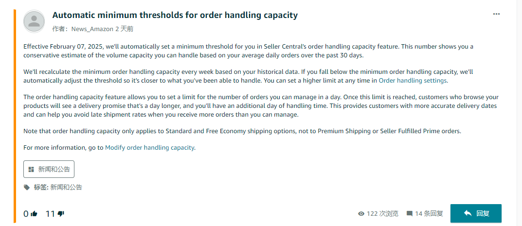 亞馬遜在公告中表示,自2月7日起,將會(huì)在Seller Central的訂單處理能力功能中自動(dòng)為賣家設(shè)一個(gè)最低閾值。該閾值是基于賣家過去30天的平均每日訂單量做出的保守估計(jì),用于顯示賣家可以處理訂單的容量。